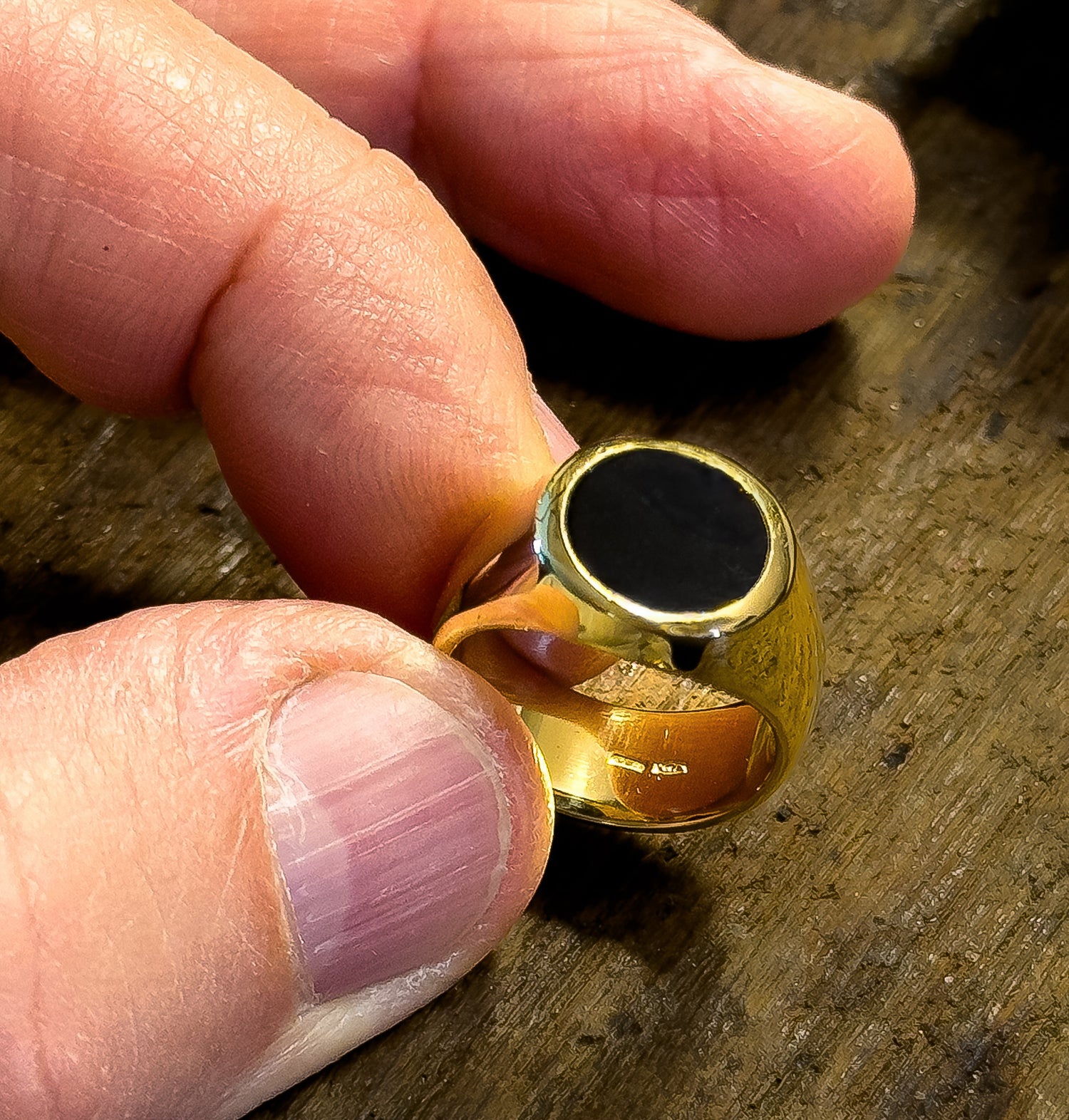 L'onice è incastonata in una montatura in oro giallo, che esalta il contrasto e dona un tocco di classe. Perfetto per chi cerca un dettaglio distintivo e sofisticato, questo anello rappresenta uno stile intramontabile.