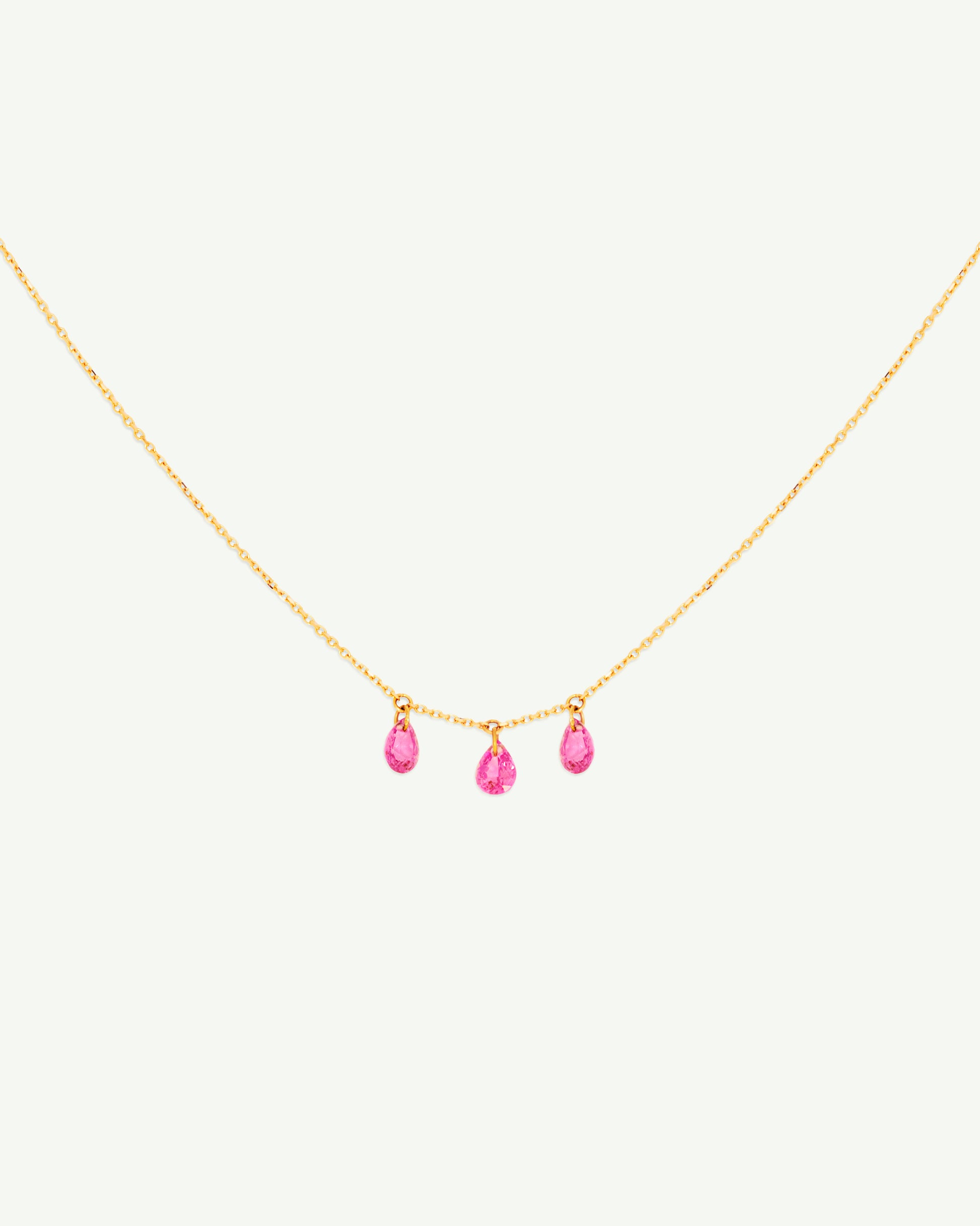 Collana creata in prezioso oro giallo 18 carati, adornato con 0,61 carati di zaffiri rosa a forma di goccia. La caratteristica distintiva di questo gioiello è che gli zaffiri non sono incastonati, ma forati, conferendo un tocco unico a un gioiello che rappresenta eleganza e femminilità. La collana ha una lunghezza di 42 cm, perfetta per valorizzare il décolleté.